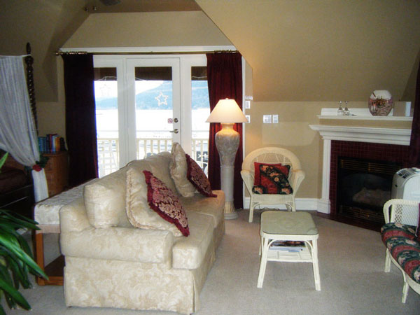 A dreamy suite occupying the entire top floor. It has a full view of Cowichan Bay from the shops outward over the water towards Salt Spring Island. With a full bathroom plus a double jacuzzi tub complemented by a gas fireplace, the suite is truly private. There is a Queen size bed, TV/VCR/DVD plus CD/Radio player, wireless internet access, A/C, as well as coffee maker and small fridge.
